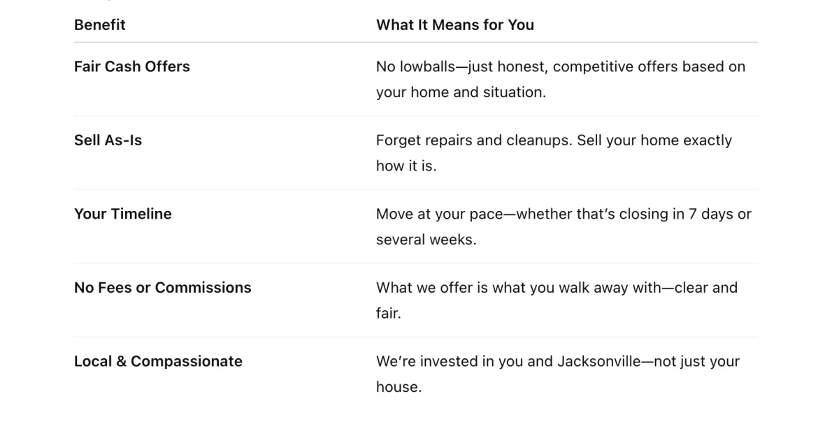 If you're downsizing, relocating, facing financial stress, or simply ready to simplify your life, we’re here to help—Jacksonville style. Reach out today for your no-obligation cash offer, and keep the burden of your property behind you.